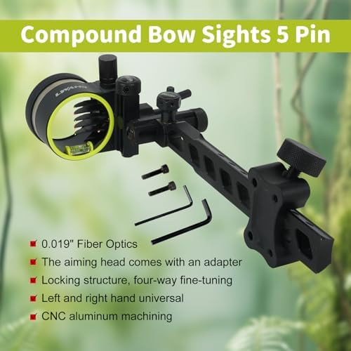 Archery 5-Pin Bow Sight – 0.019″ Fiber, Brass Pin, Aluminum Machined – Right and Left Handed, with Hi-Vis Level for Archery, Hunting, Shooting