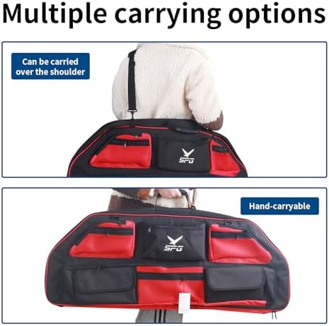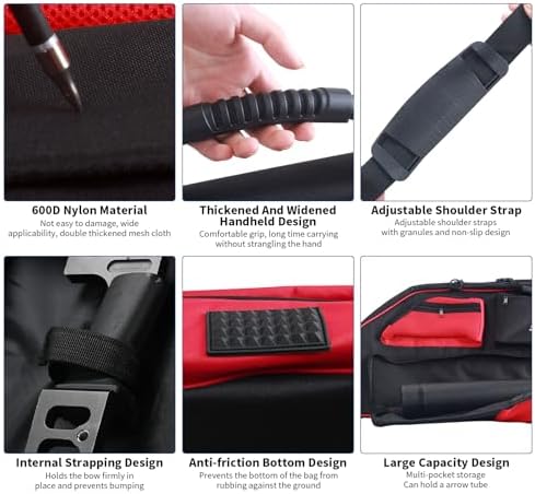 MULTIPLE CARRYING OPTIONS: The compound bow bag includes an adjustable, wider shoulder strap with pellets to prevent slipping, and the handheld strap comes with extra rubber grips for prolonged handholding without strangulation.
