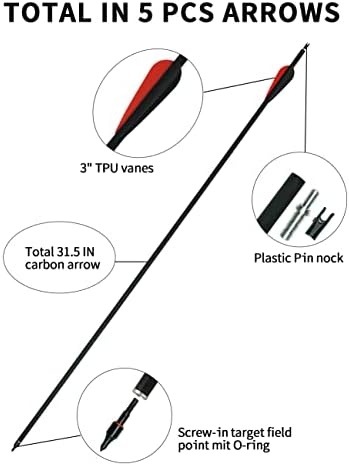 31 In carbon arrow, including 29In carbon shaft, 100grain target tip3” Vane and plastic pin nock,Outer diameter 0.309”, Inner diameter 0.244”. Weight: 35g.