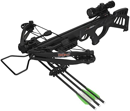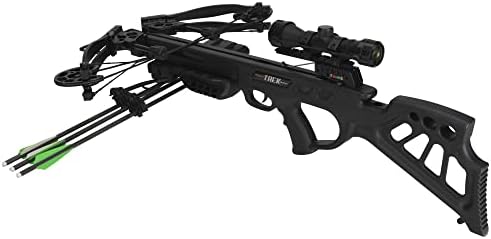 The Bear X Trek 380 crossbow comes ready-to-hunt and delivers top of the line speed, accuracy, and quality at an affordable price. Forged with the hunter in mind, this crossbow offers aggressive power and performance. The stock offers multiple grab locations making this bow easy to maneuver and shoot for various size and age hunters. The Trek 380 is field ready with a 4×32 scope with multi cross-hair reticle with functioning eye piece, 5-arrow quiver, three carbon bolts with field points, cocking rope, and rail lube/string wax.