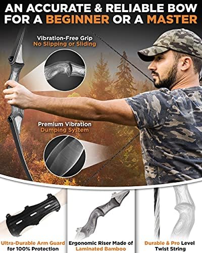 The Perfect Gift for a Beginner or a Master – Looking for a deluxe right-handed recurve bow kit that has all the accessories included and will get anyone excited? You are in the right place. As a bonus, you get a premium stringer, 5 paper targets, an Olympic t-shaped sight, string wax, finger and arm guards, a fur silencer, and a nocking point. Sporting a pro/Olympic look and feel, this bow features elements/components found only in competition wood recurve bows. Make someone happy.