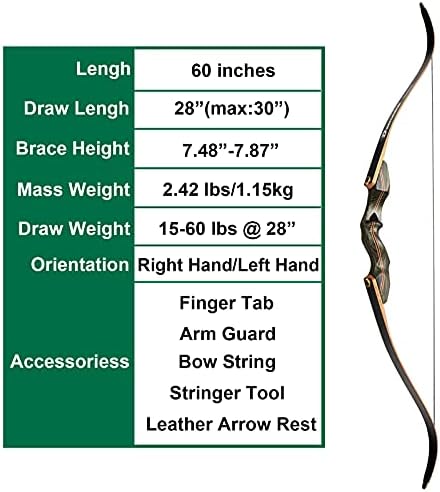 Bow limbs are laminated with maple wood core and high-quality fiberglass material, they give this bow high performance, smooth shooting, and stability. Max draw weight of 60# is good for deer hunting, and a min Draw weight of 30# is friendly for archery beginners and backyard shooting.