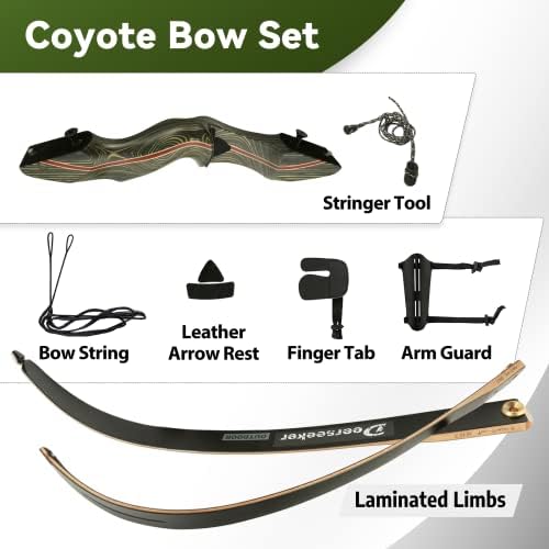 Deeseeker 60″ Coyote recurve bow. Selective wood and fiberglass, Dacron B-55 bowstring, elaborate details, comfortable ergonomic grip; Deerseeker has more than ten years of experience in manufacturing bows,which means reliable quality and durability, these details make this bow extreme good for target practice and hunting.