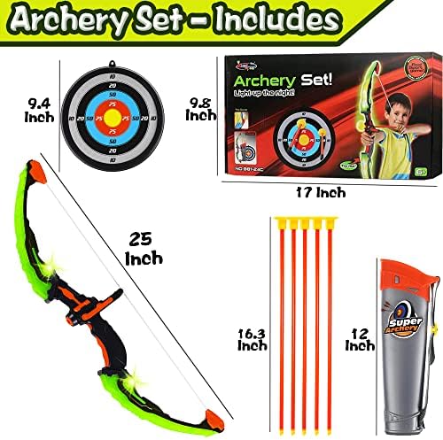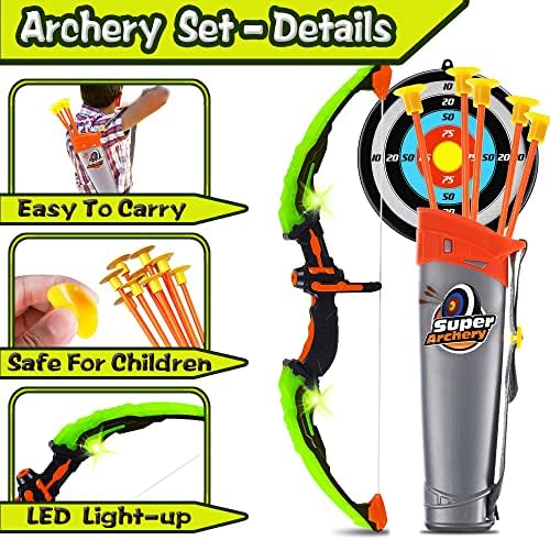 [Cool Toys With LED Lights] After inserting 2 AA batteries (not included), press the button to turn on the LED light, so that you can easily track the arrow track at night, and also increase the cool lighting effect, adding more fun to outdoor games. The range of the bow and arrow can reach 25 feet!
