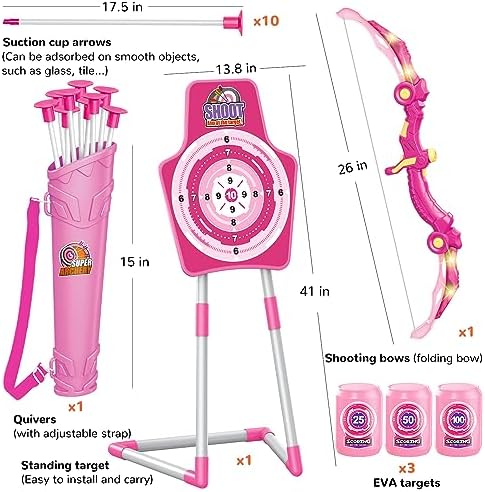 Bow and Arrow Toys for Girls 5 6 7 8 Years Old, Archery Set Includes Super Bow with LED Lights, 10 Suction Cups Arrows,Archery Set with Standing Target and 3 Target Cans, for Girls