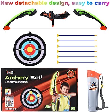 MORE ARROWS SUPER VALUE PACK: Our Kids Archery Set includes 2 bow, (length 24.6in) 12 arrows, (length 16.1in) 2 plate target(width 9.4in)2 quiver . Our Archery Bow with 3 modes flashing lights. The LED flashing lights in the toy bow illuminates while shooting the target to track the placement of arrow in the night easily.2*AAA batteries needed;