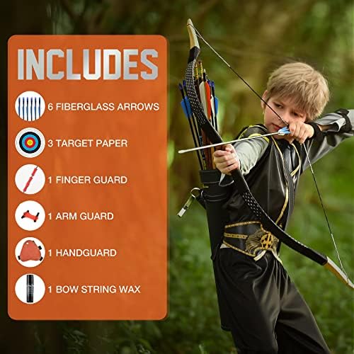 INCLUDES: FIBERGLASS ARROWS *6 TARGET PAPER*3 FINGER GUARD*1 ARM GUARD*1 HANDGUARD*1 BOW STRING WAX *1