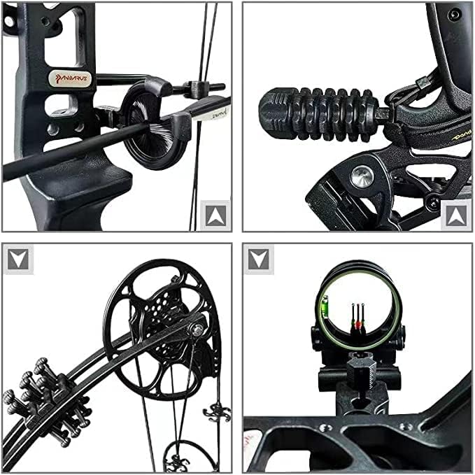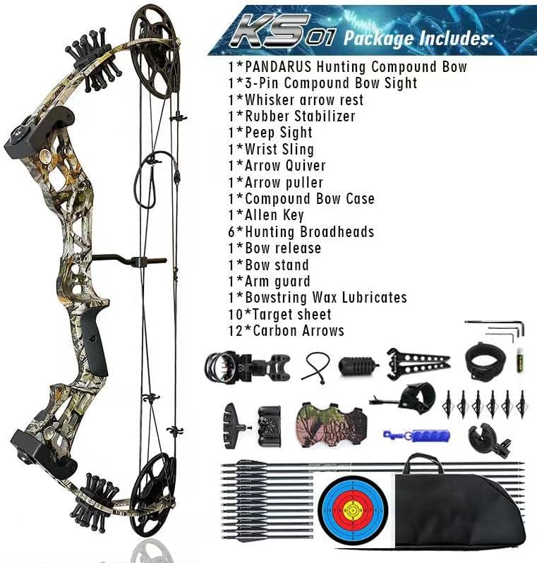 1 *PANDARUS Hunting Compound Bow //1*3-Pin Compound Bow Sight//1*Whisker arrow rest//1* Rubber Stabilizer//1*Peep Sight// 1*Wrist Sling//1* Arrow Quiver//1* Arrow puller//1*Compound Bow Case//1* Allen Key//6* Hunting Broadheads//1* Bow release//1* Bow stand//1*Arm guard//1* Bowstring Wax Lubricates//10*Target sheet//12 *Carbon Arrows