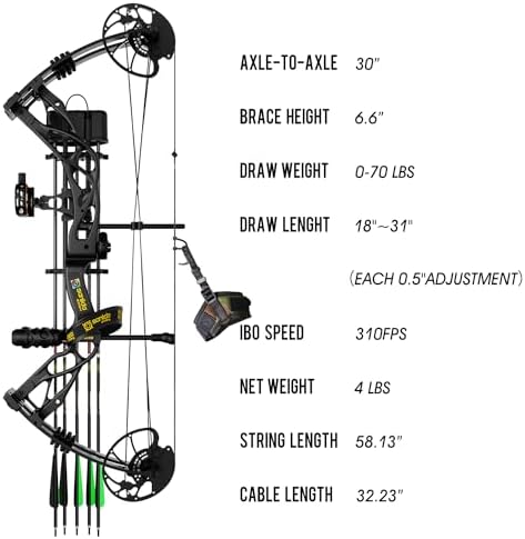 【Specifications】 Large range of adjustable draw length 18-31″(each 0.5″ adjustment), draw weight 0 -70 lbs without needing a bow press. A bow for all ages and skill levels. Axle-to-Axle 30″, Brace Height 6.6″, IBO Speed 310 FPS, Let off 70%-80%, Net Weight 4 LBS, String Length 58.13″ , Cable Length 32.23″. For the extra replacement string and cables, B091291VDQ is for the Dragon X9 compound bow.