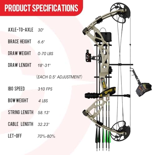 【Specifications】 Large range of adjustable draw length 18-31″(each 0.5″ adjustment), draw weight 0 -70 lbs without needing a bow press. A bow for all ages and skill levels. Axle-to-Axle 30″, Brace Height 6.6″, IBO Speed 310 FPS, Let off 70%-80%, Net Weight 4 LBS, String Length 58.13″ , Cable Length 32.23″. For the extra replacement string and cables, B091291VDQ is for the Dragon X9 compound bow.
