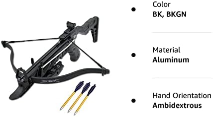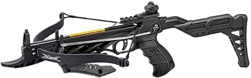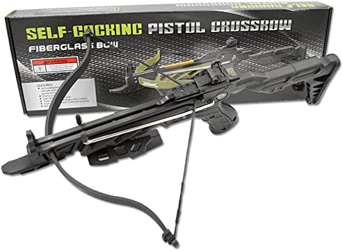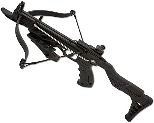 Snake Eye Tactical Cobra System Self Cocking Pistol Grip Pistol Tactical Crossbow 80-Pound 225+ FPS Ideal for turkey/small game hunting The Crossbow features an 80 lb. draw weight and fires bolts up to 225 fps. This crossbow includes an easy cocking stock, automatic safety mechanism and fore grip with finger guard. In addition, the adjustable stock, adjustable sight and weaver rails provide unparalleled customization. The Shredder Crossbow includes three 7/8” broad head hunting bolts and three aluminum bolts