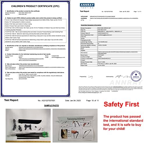🌟Safety First: non-sharp arrow tips, finger saver attached to the bowstring, and arm guards in the bow set will keep your kids safe while shooting. But for safety and correct practice, Children are best used under the supervision of adults.Wear and use instructions are in the manual in the package.The product has been certified by the authority. CHILDREN’S PRODUCT CERTIFICATE (CPC) and product test report can be provided. You can buy it for your children with confidence.