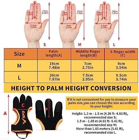 PACKAGE INCLUDED: 1 PC Arm Guard + 1 PC Finger Glove ( M /L Size to choose). Both of them are essential protective equipment for archery activities, whether it is for archery competitions, normal practice or outdoor hunting. WHY NEED PROTECTIVE GEARS: An arm guard is a piece of protective equipment worn on the forearm of the arm holding the bow in archery. It is designed to protect the skin on the bow arm from the bowstring during the shooting process; Finger gloves can provide additional protection for the fingers that grip the bowstring while also improving accuracy and consistency. ARM PROTECTOR: Size 23 cm X 10 cm X 4.5 cm (9.06 in X 3.94 in ); The arm guards are made of a soft, flexible foam material wrapped in double-sided cloth that conforms to the shape of the forearm. They are designed to be lightweight and comfortable, making them a great choice for archers who want a minimalist and non-restrictive arm guard. And they are easy to clean and maintain. 3 FINGER GLOVE: M / L Size to Choose; Made of high elastic and soft polyester material with premium quality thickened leather; Durable, light weight, good elasticity, soft and breathable, long-term wear will not appear hand sweat;The gloves have an extra cowhide anti-slip padding near the fingertips: from about the middle knuckle to the fingertip to provide extra protection. ADJUSTABLE: SPG Arm and finger guards set are adjustable design. Archery gloves with velcro strap on wrist, adjustable Wristbands can be adjusted to fit a wide range of wrist sizes. Arm Gards have Elastic straps with adjustable buckle design, suitable for different arm sizes of archers.(M /L Glove? Refer to our size chart that comes with a detailed sizing guide to help you make the right size choice.)