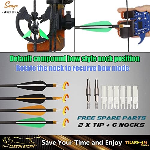 The SUNYA arrows come with a compound bow style nock by default. However, the nocks can be changed to fit both recurve and compound bows, offering flexibility and compatibility with different bow types.