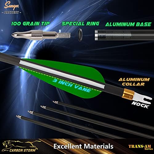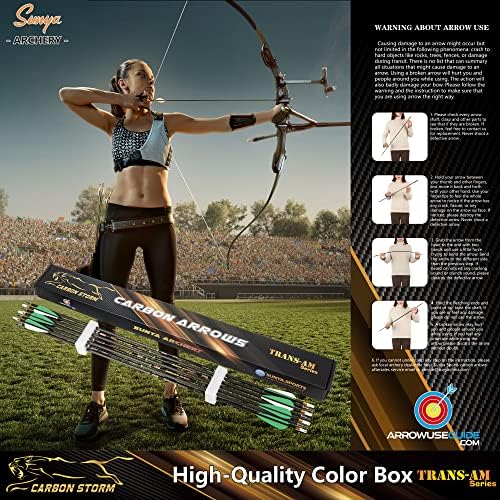 Excellent Materials: Precision carbon shaft arrows are great for hunting and targeting practice. The removable stainless steel point is very sturdy. Comes with the most common 100-grain arrow tip which is tightened enough and could be replaced by other types easily. Compare to the cheap material made arrows, the SUNYA carbon arrow brings more durability which lasting for years.