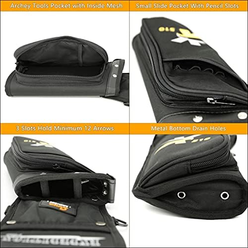 Good Structure: 16.5″ x 7″ (42x18cm) Rear Facing Arrow Quiver Design. 2 Sound Damping Arrow Separators Prevent Arrow Rattling Noise. 1 Zipper Pocket With Inner Mesh. 2 Slide Pockets, 2 D-Rings And Slots For Pencil. Drain Holes On The Bottom. Including Adjustable Belt.