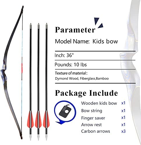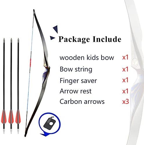 Package include: 1*wooden kids bow + 3*carbon arrows + 1*arrow rest + 1*bow string + 1 pair finger saver.