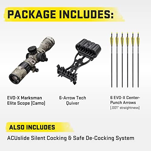 WHAT’S INCLUDED – The Nitro 505 Crossbow comes with a EVO-X Marksman Elite Scope, our ACUslide Cocking and De-Cocking System, six Evo-X CenterPunch Premium Carbon Crossbow Arrows, and a 6-Arrow Tech Quiver.