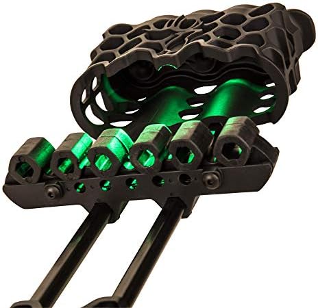 THE ALL-NEW HEX LIGHT ARROW QUIVER FEATURES FOUR GLOWING GREEN LED LIGHTS ? THREE ON TOP OF THE HOOD AND ONE INSIDE Built-in LED lights illuminate arrows and surroundings in low light Soft-touch hood construction reduces vibration and eliminates noise Features quick attachment design for fast and easy mounting and detachment Adjustable mounting offers low profile against the bow and arrow containment within the bow Customizable single or dual arrow grippers and precision-designed hood included