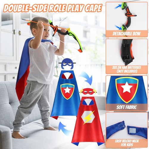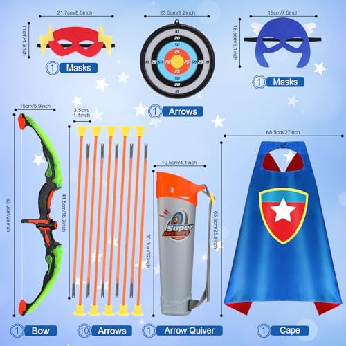 【Superhero Dress Up and Light-Up Archery Bow】Every kid has the dream of being a superhero during childhood time. They can enjoy wearing their satin superhero cape (length: 27 in) and 2 premium felt masks while they play heroes with friends. Liven up your child at daytime and nightfall play with this LED light-up bow which adds a cool and captivating effect to their archery experience! 2*AAA batteries needed (not included)