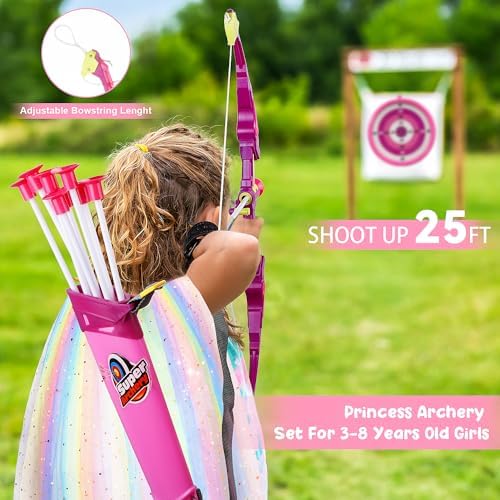 【Perfect Toys Gifts for Girls 3 4 5 6 7 8 Year Old】A great gift for outdoor games, pretend play, birthday parties, class parties, Halloween and Christmas gifts and is also the 3 4 5 6 7 8 year old girl birthday gift ideas. This princess toy – bow and arrow is a wonderful gift for your little archer