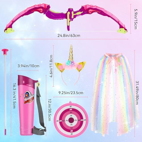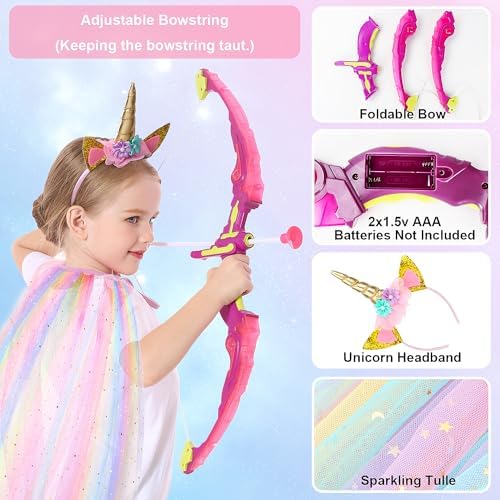 【Princess Dress Up and Light-Up Archery Set】The princess cape and Unicorn headband put the little girl into a fairytale situation, making the archery game experience more realistic and fun. The Unicorn toy liven up your child at daytime and nightfall play with this LED light-up bow which adds a cool and captivating effect to their archery experience! 2*AAA batteries needed (not included)