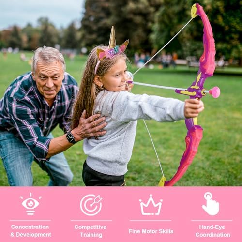 【Educational Through the Fun Games】The outdoor toys for girls 4-12 is also very suitable for parent-child outdoor games, practicing their fine motor skills, accuracy skills and hand-eye coordination, promoting healthy growth and becoming confident. The bow and arrow for kids is a good introductory bow if you want the child to be interested in archery. A good toys for girls gifts age 4 5 6 7 8-12 to play indoors and outdoors