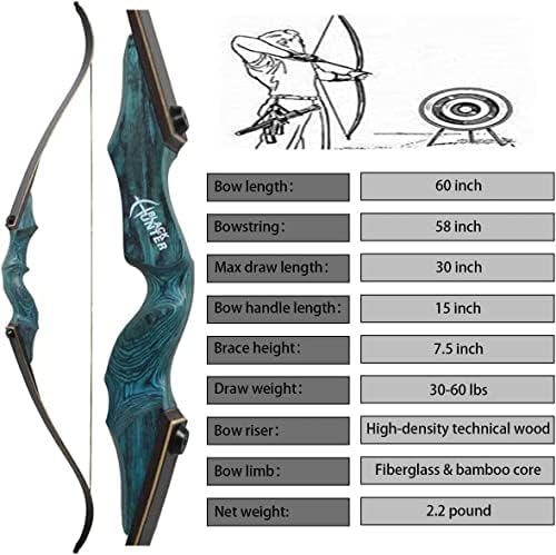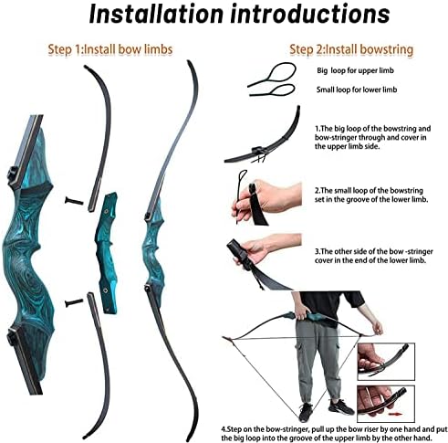 The Vogbel takedown recurve bow and arrows set is an ideal equipment for hunting shooting practice. Product Details: – Bow length: 60″ – Bow string length: 56″ – Bow riser length: 16″ – Draw weight: 30lb, 40lb, 45lb, 50lb, 55lb and 60lb – Handedness: right handed – Bow riser: bamboo – Bow limbs: wood Laminated – Arows length: 31″ – Package weight: 5.3lb Package Listing: – 1 × Recurve bow – 1 × Bowstringer tool – 1 x Fur arrow rest – 1 × Arm guard- 1 x Finger guard – 1 x Archery finger glove – 1 x 3 Tube arrow quiver- 6 × Arrowhead(with box) – 12 × Mixed carbon arrows User Notice 1 Never “dry fire” the bow (shooting without an arrow). 2. Do not shot against concrete wall or any hard substance. This may damage the arrows. 3. Note for arrow vane: If the arrow feather is deformed during transport, you can soak the deformed feather in hot water at 80 ° C to 90 ° C and adjust the deformed feather arrow to rest. If it can not, you should repeatedly. 4. The arrowhead can become loose during transportation, please check the tightness of the arrowhead before use. 5. There might be slight measure difference due to manual measurement error.